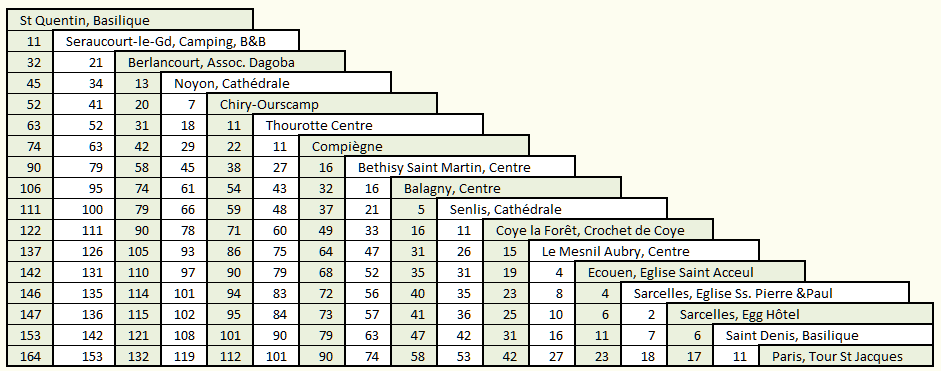 Sur certains sections du Chemin, les hébergements sont rares.Néanmoins, à l'aide de ces tableaux, il est possible de prévoir ses haltes selon sa propre vitesse de marche.